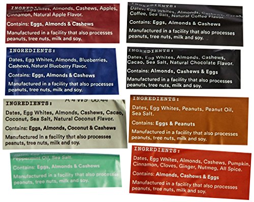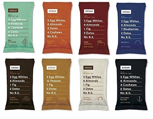 -. Feature : Healthy, delicious protein bars made with nutritious, real food ingredients / Each variety pack of RXBARs contains one bar of each delicious flavor: / Chocolate Sea Salt, Coconut Cacao, Blueberry, Coffee Cacao, Peanut Butter, Apple Cinnamon, Pumpkin Spice and Mint Chocolate. / Eight or Less 100% Natural Ingredients: No grains, added sugars, gluten, soy, dairy or any artificial or processed ingredients. / 12g of protein in every 1.83 ounce bar comes from all-natural egg whites and raw almonds.