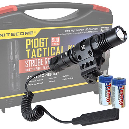 - COMPLETE TACTICAL & MOUNTING KIT - Nitecore P10GT Tactical Flashlight, Padded Tactical Carrying Case, Premium Holster, Removable Steel Belt/Pocket Clip, Nitecore Lanyard, Tactical "Cigar" Ring, CR123 Battery Magazine, Replacement Rubber Switch Cap, 2x Spare O-rings, lumen Tactical Picatinny offset rail mount, Nitecore RSW2 Remote pressure switch, Hex-key Allen wrench, & 2x CR123A Batteries