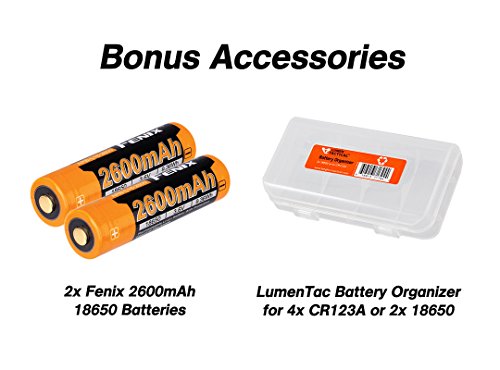 - PACKAGE CONTENTS - Fenix TK35UE 2018 Flashlight, Spare O-Ring, Lanyard, Holster, USB Charging Cable, User Manual, 2x Fenix 2600mAh 18650 Rechargeable Batteries, Lumen tactical Battery Organizer