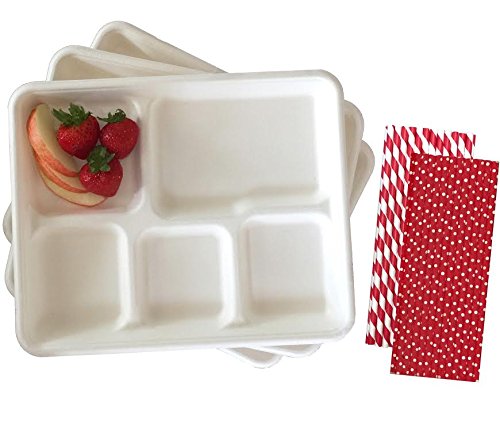 Outside the Box Papers Biodegradable Retro Style Lunch Trays -24 Pack and Red Paper Drinking Straws - 50 Pack Red, White