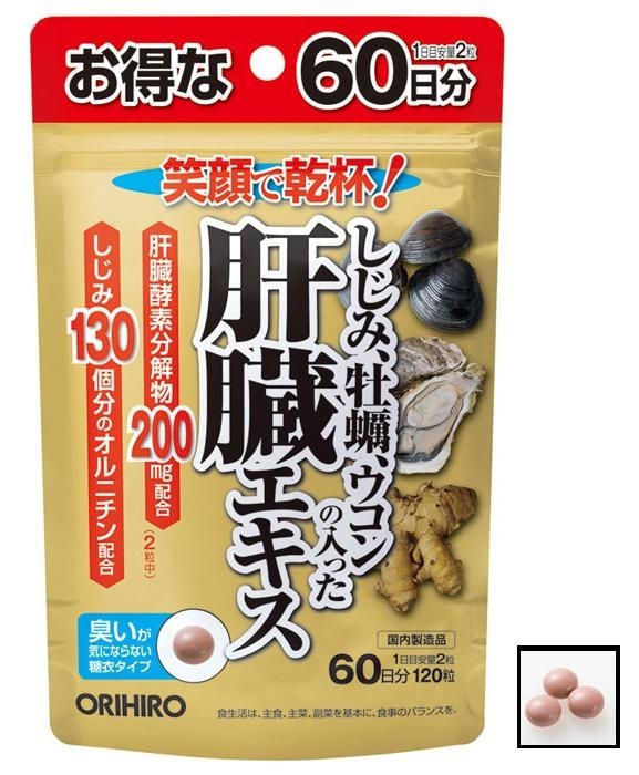 | 栄養成分 | 製品2粒(1.14g)中/熱量:3.9kcal、たん白質:0.24g、脂質:0.02g、炭水化物:0.68g、ナトリウム:0~10mg 【主要成分】肝臓酵素分解物200mg、しじみエキス末100mg、牡蠣肉濃縮エキス末20mg、秋ウコン濃縮エキス末20mg、クルクミン30mg、オルニチン50mg、イノシトール5mg、ビタミンB1 5mg、ビタミンB2 2mg、ビタミンB6 3mg、ビタミンB12 2μg、葉酸 200μg、亜鉛 1mg |