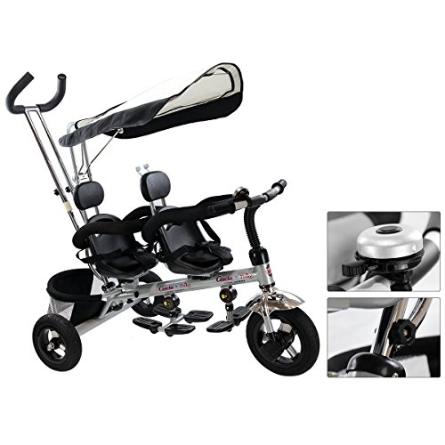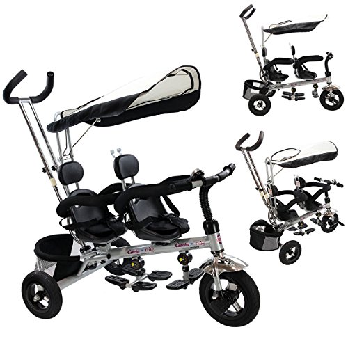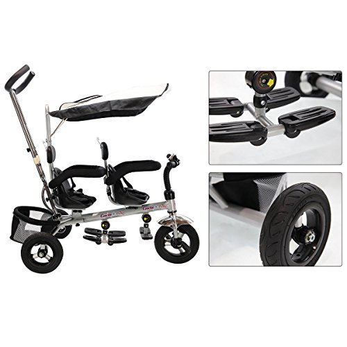 Studio : MTN Gearsmith Publisher : MTN Gearsmith Product Description Description Every child remembers their first bike. Make those special memories with our twins children tricycle! This tricycle is ideal for the family with not only one kid. There are two set making it possible for parents to walk the twins in the same time. Great features such as the tricycle's high back seat and 3-point seat belt, provide the perfect combination of comfort and child safety. This tricycle makes learning to ride fun and easy, while the wide, long-lasting EVA tires offer a stylish look your. With a removable push handle, adults are able to walk comfortably as they control the steering and speed of the tricycle. Choose This Without Hesitation! Feature Brand new and high quality. 2 sets for the family with not only one kid. Can be assembles in 4 ways according to your kid's age Removable canopy for UV protection High-back seat for comfort and safety removable wrap around safety bars and a 3-point safety belt Multi Adjustable Push handle can control tricycle movement Front and Back Foldable Footrest, Pedals become footrests for early stages Back storage basket Includes bell Specifications Color: Black Material: iron and PP plastic (frame), rubber(wheels), 600D oxford cloth(shade canopy), EVA sponge(protect bar and holder) Size: 40' x 24' x 39'(W) Product Weight: 34lbs weight Capacity: 66lbs Suitable age:18-36months Package included: 1 x children tricycle, 1 x installation manual 0