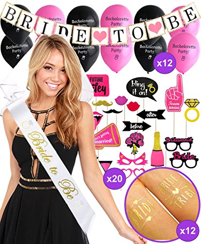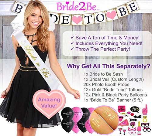 -. Title : BACHELORETTE PARTY DECORATIONS KIT | Bride To Be Bridal Wedding Shower Set | Sash, Veil/Comb, Banner, Bride Tribe Tattoos, Photo Booth Props, Balloons | Wedding Engagement Party Supplies Accessories