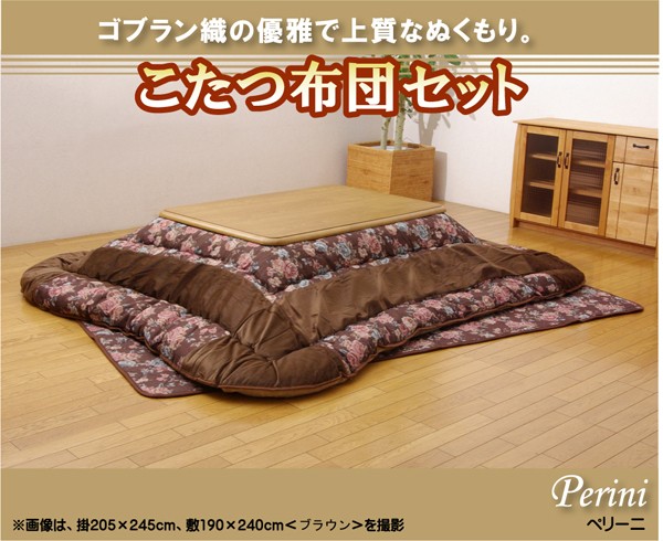 掛け=表地)(柄部)ポリエステル75%、綿20%、レーヨン・ナイロン5%【ゴブラン織】 (無地部)ポリエステル100%【ベロア】 裏地)ポリエステル100%【フランネル】 中材)ポリエステル100% 2.2kg 敷き=表地)ポリエステル75%、綿20%、レーヨン・ナイロン5%【ゴブラン織】 裏地)ポリエステル80%、綿20% 中材)ポリエステル100%+ウレタンフォーム8mm