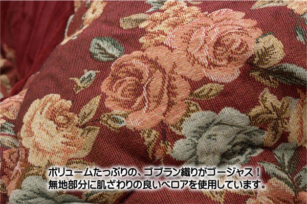 エレガンスな装いのこたつ布団です。重厚な質感とまるで絵画のような繊細な柄を表現できるゴブラン織りで仕上げました。無地部分には肌触りがソフトで深みのある光沢が特徴のベロアを使用しています。肌に直接触れる裏地部分にはフランネルと呼ばれる、しっとり柔らかい生地を使用し、暖かさにもこだわりました。部分暖房のコタツは電気代もおトクです。