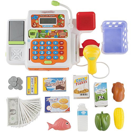 The Hey! Play! pretend electronic cash register with real sounds and functions is a real-working battery-powered cash register with many of the same features as the ones in grocery stores. It helps children learn the basics of working with money, buying, and ringing up sales, while being fun to play with. Each set comes with play money in coins and us bills, a credit card, and food items to buy and sell. It features a working calculator that accurately adds number inputs on a digital display, a hand Scanner that lights up and beeps when it scans, and a credit card slot that beeps as it is swiped. A basket, a scale and a conveyor belt make playing with the food feel just like grocery shopping with mom and dad.Feature
