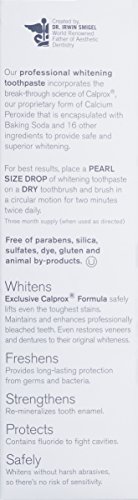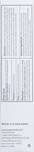 Supersmile safely and painlessly whitens and remineralizes teeth and dental restorations (bonding, caps, veneers, and dentures) without harmful bleaches or abrasives. Supersmile professional whitening toothpaste is 75% less abrasive than the limit set by the American Dental Association. Our professional whitening toothpaste is clinically proven to inhibit plaque 10 times better than the leading plaque-removing toothpaste. Use a pearl size drop twice a day to remove coffee, tea, tobacco, red wine, and food stains to see fast results. Calprox works by gently dissolving the protein pellicle, a thin layer of protein that forms on the surface of teeth, to which plaque, bacteria, and stains adhere. Safely removing the stained pellicle without the use of harsh abrasives, like Silica, leaves the teeth looking and feeling cleaner for a longer period of time. Made in the USA.Feature
