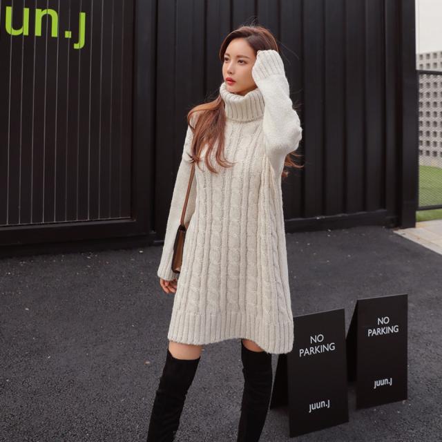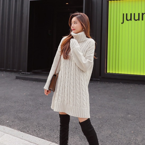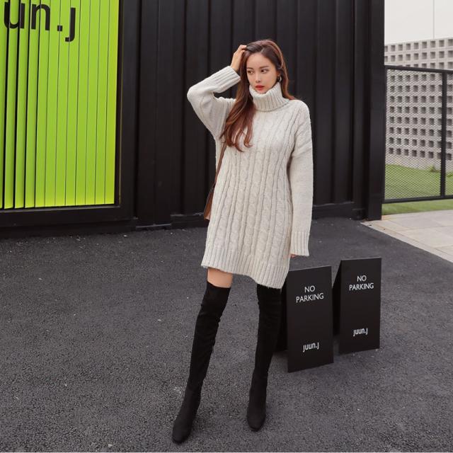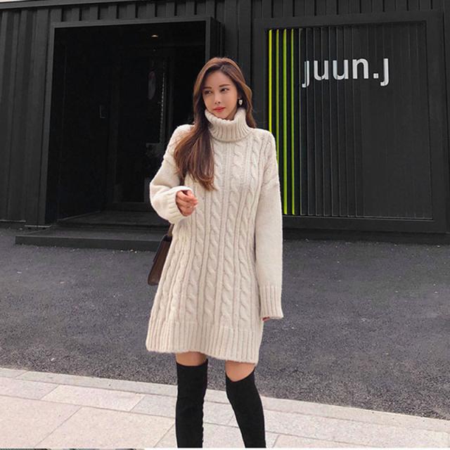 タートルネック 長袖 無地 ミディアム 可愛い ニットワンピース