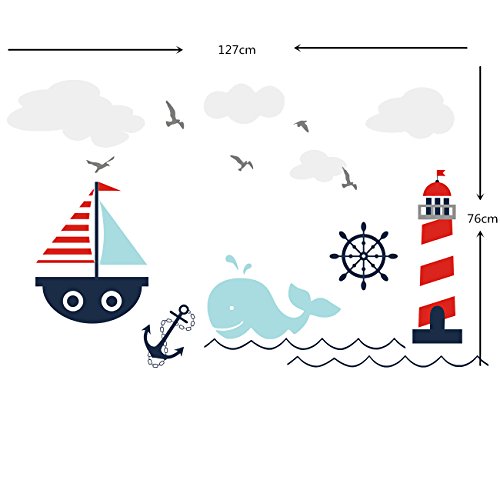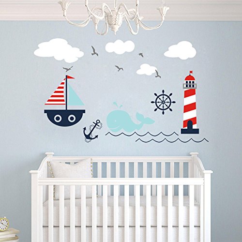Higoss Nautical Baby Nursery Wall Decal Lighthouse Whale and Sailboat Vinyl Wall Art Sticker
