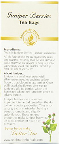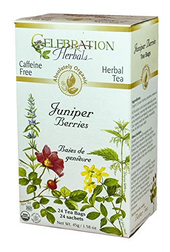 -. Binding : Grocery -. Brand : Celebration Herbals -. EAN : 0628240201546 -. Feature : Juniper is a small evergreen with silver-green needles and tiny yellow flowers that bloom in late spring / Celebration Herbals -. Label : Celebration Herbals -. LegalDisclaimer : This statement has not been evaluated by the Food and Drug Administration. This product is not intended to diagnose, treat, cure, or prevent any disease. -. Manufacturer : Celebration Herbals -. MPN : CEL201546 -. NumberOfItems : 1 -. PackageQuantity : 1 -. PartNumber : CEL201546 -. ProductGroup : Health and Beauty -. ProductTypeName : GROCERY -. Publisher : Celebration Herbals -. Size : 24 -. Studio : Celebration Herbals -. Title : Celebration Herbals Organic Juniper Berries Tea Caffeine Free -- 24 Herbal Tea Bags -. UPC : 628240201546