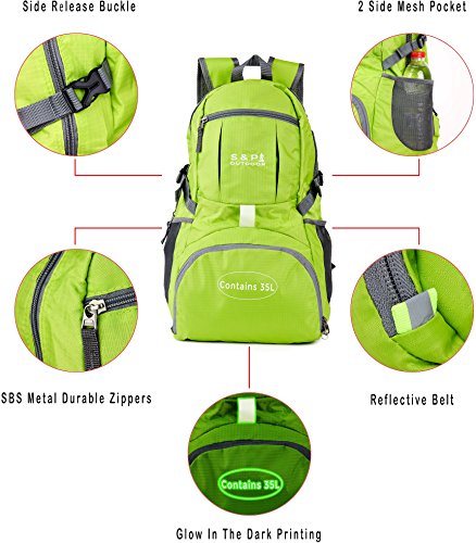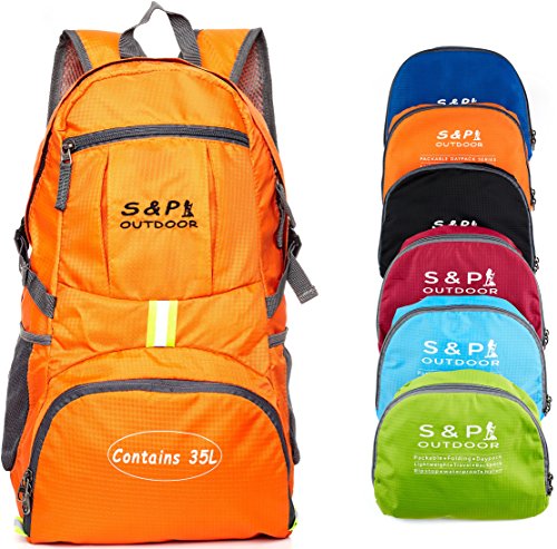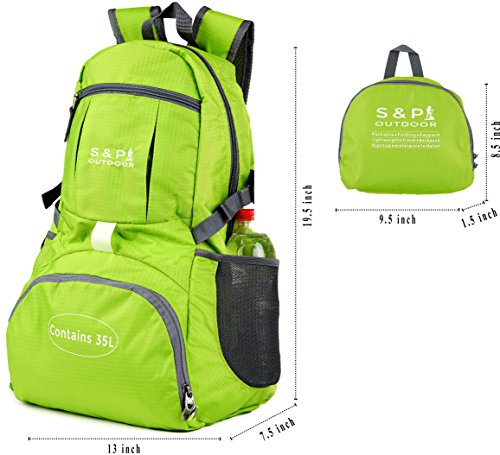 -. Brand : S & P Safe and Perfect -. Feature : DURABLE. This S & P Backpack is made from SPECIFICALLY DEVELOPED ARMY DESIGNED, extra density, durable and water resistant nylon fabric that provides strength and long-lasting performance with minimal weight. Stress points are reinforced with bar tacking for increased longevity. Durable 2-way Abrasion Resistant SBS Metal Zipper across all the backpack zippers. / COMPACT. Folds into zippered front pocket that can fit anywhere. Unfolds from pocket to backpack. Must have on every trip and a great gift for all. / 100% CUSTOMER SATISFACTION GUARANTEED. S & P makes everything, to ensure our product to be state of the art in terms of quality. If you will not be satisfied, for any possible reason, from our product, you will get your money back, NO QUESTIONS ASKED!!! / MULTI COMPARTMENTS and KEEP THINGS ORGANIZED. This backpack features one main zipped compartment, two zipped front pockets and two side pockets (total 8 pockets). Main compartment provide enough room. If it's a day trip or a week long journey. Two separators in the main compartment are convenient enough to help you further organize things. The two front pockets are good for holding small accessories and for easy access. Two side pockets are good for holding water bottles and umbrellas. / COMFORTABLE. Breathable THICK mesh shoulder straps with plentiful sponge padding help relieve the stress from your shoulder. The length of the shoulder straps is adjustable. The chest strap with a whistle buckle help you lock your backpack in place securely. -. IsAutographed : 0 -. IsMemorabilia : 0 -. Label : S & P Outdoor -. Manufacturer : S & P Outdoor -. MPN : S & P 001/17 -. PartNumber : S & P 001/17 -. ProductGroup : Sports -. ProductTypeName : OUTDOOR_RECREATION_PRODUCT -. Publisher : S & P Outdoor -. Size : 35L -. Studio : S & P Outdoor -. Title : S & P Outdoor 35L Sport waterproof Lightweight Packable Durable folding Travel Hiking Trekking Camping Cycling Foldable Ultralight and Handy Daypack Backpack