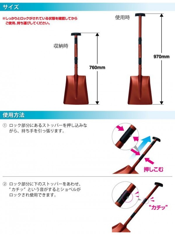しっかり使えるロングサイズの、軽量組み立て式ショベルです。 |