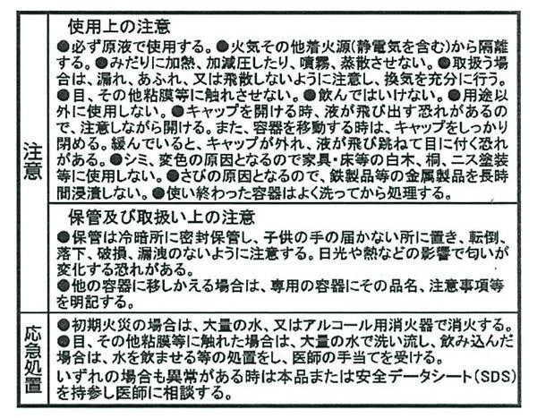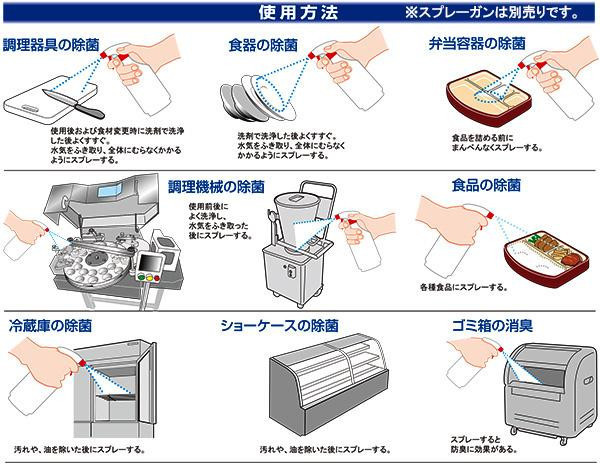 成分の効果的な配合バランスにより強力な除菌効果があります。厨房や店舗、施設の日常的な衛生管理に活用できます。万一、水分で薄まった場合でも強力な除菌効果を発揮!!食品添加物ですので食品に噴霧したり、浸漬・練り込みするといった使い方で調理済みの料理や加工食品の除菌、静菌に便利です。非危険物で法令による保管量、保管場所の制限や許可申請手続きが必要ありません。 |