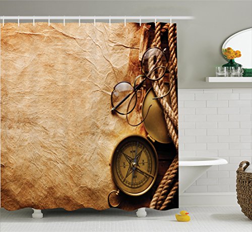 Ambesonne Compass Decor Collection, Various Wind Rose Retro Design Collection Geographic Direction Silhouette Art Print, Polyester Fabric Bathroom Shower Curtain Set with Hooks, Brown Copper