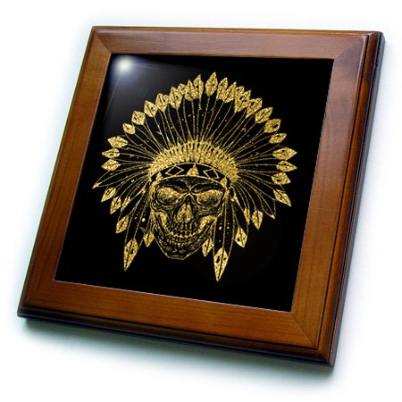 3D Rose Black Tribal Skull Framed Tile, 8" x 8", Gold
