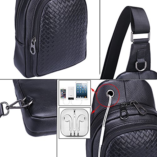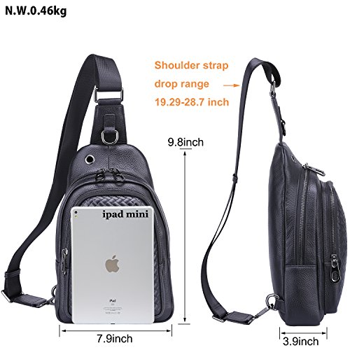 -. Feature : Imported cow hides leather and branded polyester twill lining / Front pocket with embossed pattern design.Adjustable shoulder strap can hang two convertible metal button in the bottom to fit left-handed and right-handed person. / A conventient headphone cord access on the top. / Used as chest pack, shoulder bag, crossbody bag,messenger bag. Suitable for your daily life, carrying mobilephone, Kindle, wallet, pens, etc. / Size:7.8 x 4 x 9.8 inch (20 x 10 x 25 cm); Net Weight: 0.46kg