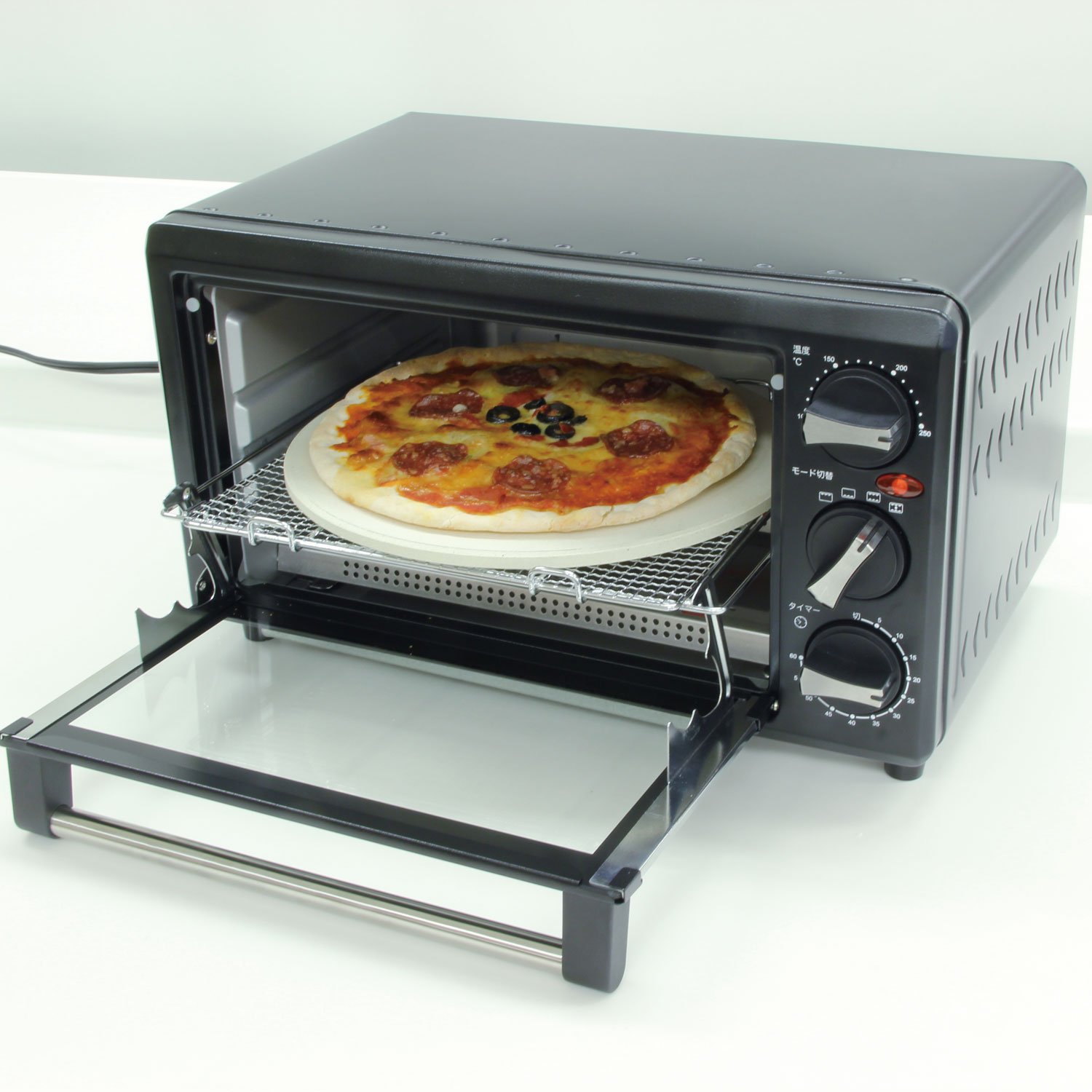 Power consumption: 1200 W Material: iron · tempered glass · PA 66 (polyamide) Accessories: tray, grill net, pizza plate, handle, breadcrumb tray Warranty: 1 year from date of purchase ※ Before using the instruction manual