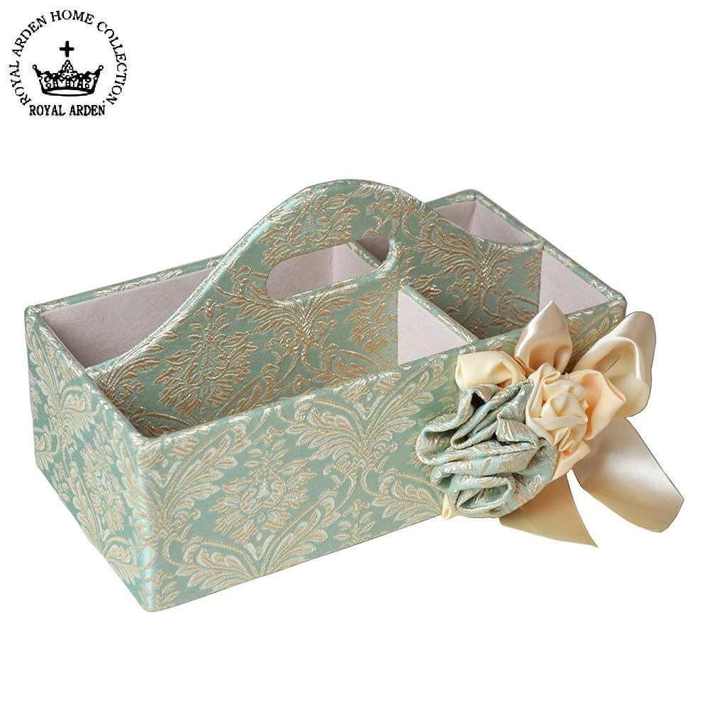 ボリュームのある豪華なコサージュがワンポイント☆仕切り付きなので、リモコンや小物を分けて収納することができ、テーブルの上もすっきり♪ 製造国:中国 素材・材質:ポリエステル100% 商品サイズ:W26×D16.5×H16cm ※サプライヤー直送品 ご注文後3~4営業日後の出荷となります【商品名】ロイヤルアーデン リモコンラック アクアフラワー グリーン 77900