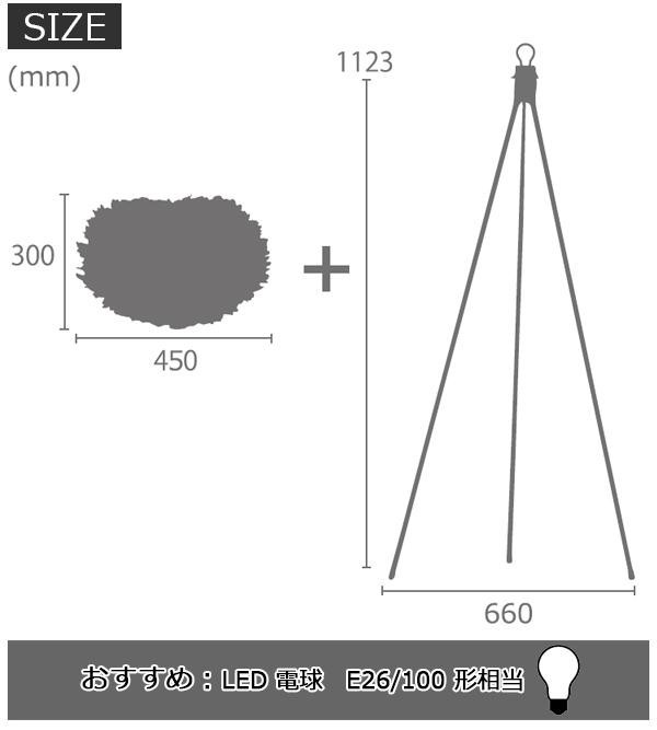 | 仕様 | 組立式 定格電圧:100V 50/60Hz 点灯:中間スイッチ(コンセント) 電球:E26/100形相当(LED/1個)※別売 |