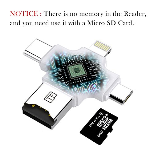 -. Feature : Fit all your devices with four interfaces, Support All Popular-format (Please see description for details). Compatibility with iPhone 6s, iPhone 6s Plus, iPhone 7, iPhone 7 Plus, iPhone 5, iPhone 5s, iPhone 5c, iPod 4, iPad 4, iPad mini, iPad Air, iPadpro, Mac. / Easily & Directly stores, transfer photos and videos between iPhone, iPad, iPod, PCs and Mac Computers, Android Phone, support 8G~128G SD and TF card. / On the Free APP "iUSB Pro", you could manage your data directly anywhere with the multipurpose card reader. / Lightest and most compact design on the market, weighing 7g and measuring 4.8cm in length for convenient transport. / Support Multiple Types of Files -- The reader can support office, PDF, pages and so on, Reading speed: 20~27M/S; Writing speed: 11~20M/S. Notice: the Card Reader Does not include Memory Card.