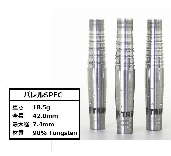 グリップ部分の形状をストレート・テーパー・ストレートと配置して、テーパー部分を14mmと親指幅程にする事により、ここしかないというグリップ位置と絶妙なグリップ感を実現。重心はセンターやや前で18.5gという重さをしっかり感じながら飛ばす事ができ、バレル後方をグリップする方であれば、どのようなグリップでもしっくりはまり、クセがなく人を選ばないまさにオールラウンドといえるバレルです。 |
