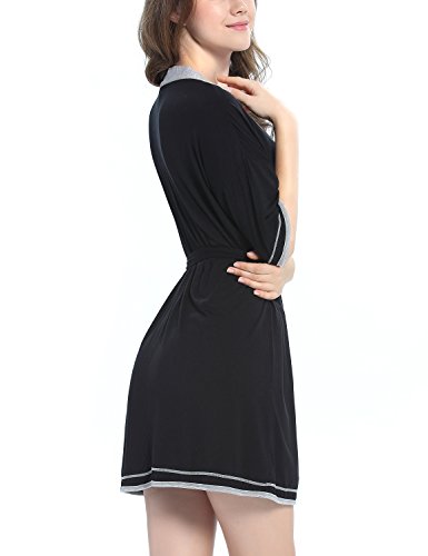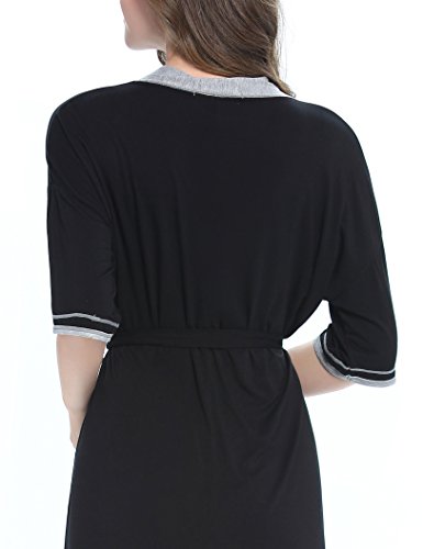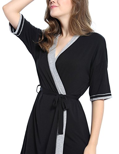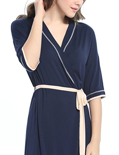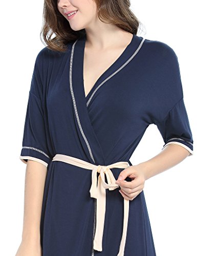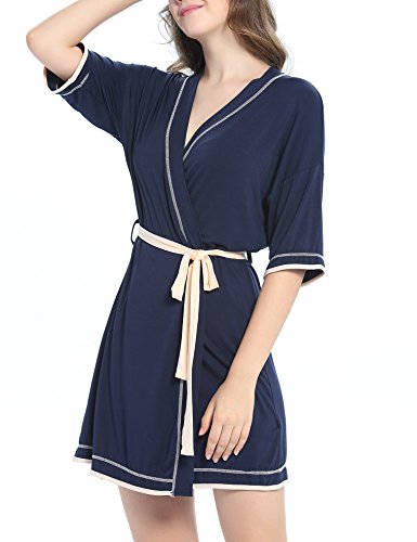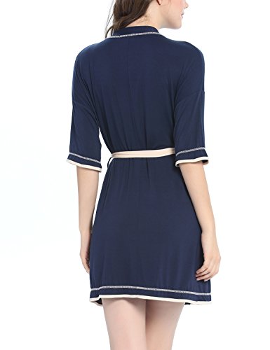 -. Feature : This bathrobe for women featuring kimono collar, removable belt at waist, adjust the robe to fit your body well. / Soft and skin-friendly fabric with stretch, classy,light weight, comfortable and durable. Knit fabric dry your body up and keep you warm in autumn, winter and sP.R.Ing. / Kimono Robe Featuring patchwork contrast color design, 3/4 sleeve and mid-thigh length, Scoop neck Tee with Drop Shoulders. / Perfect for lounging around the house,everyday bath,loungewear and sleepwear. Ideal Christmas gift for wife, mom, daughter or friend. / Available in Black / Dark blue, Size : XS,S,M,L,XL. Our soft knit easy fit robe is standard US size, please kindly choose your general sleepwear size