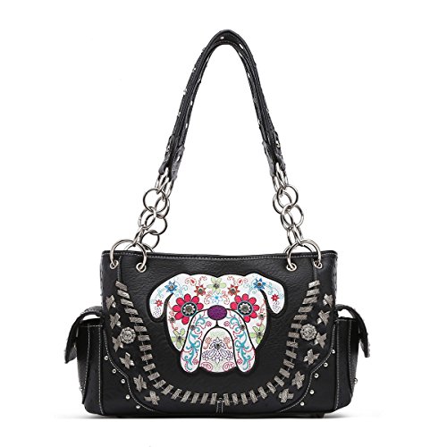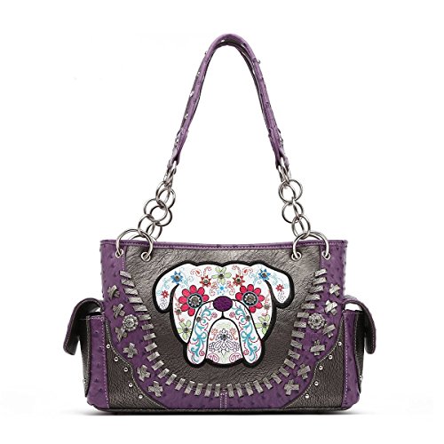 Product Description Bulldog lovers will be pleased at the sight of the embroidered sugar skull Bulldog on the front of this adorable handbag. When going out during the weekends or just hanging out with friends, opt for this stylish bag with a western touch. It can fit your i-Pad, mobile phone, planner, wallet and all your lady essentials. Simple yet stylish that goes well with most outfits. A perfect gift for your girlfriends too! 0