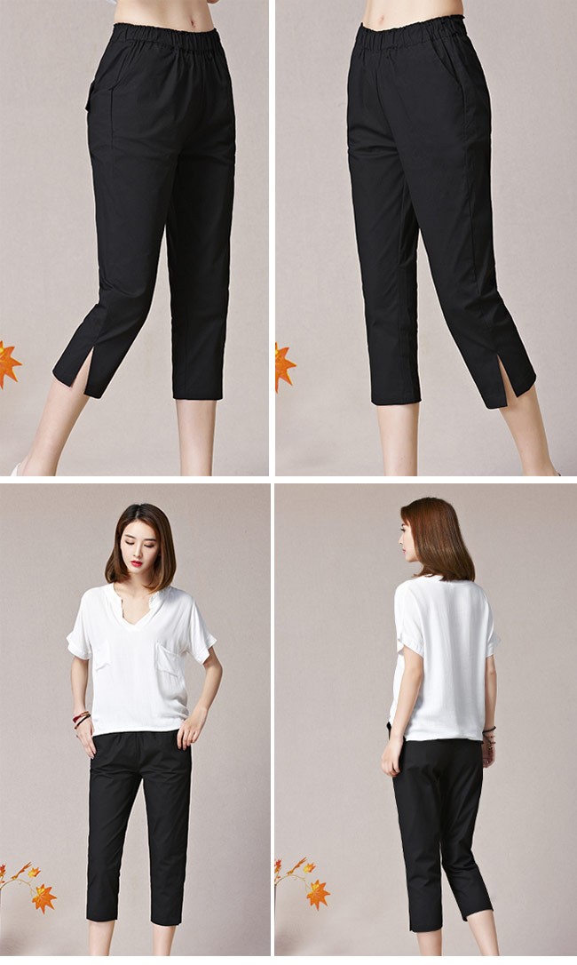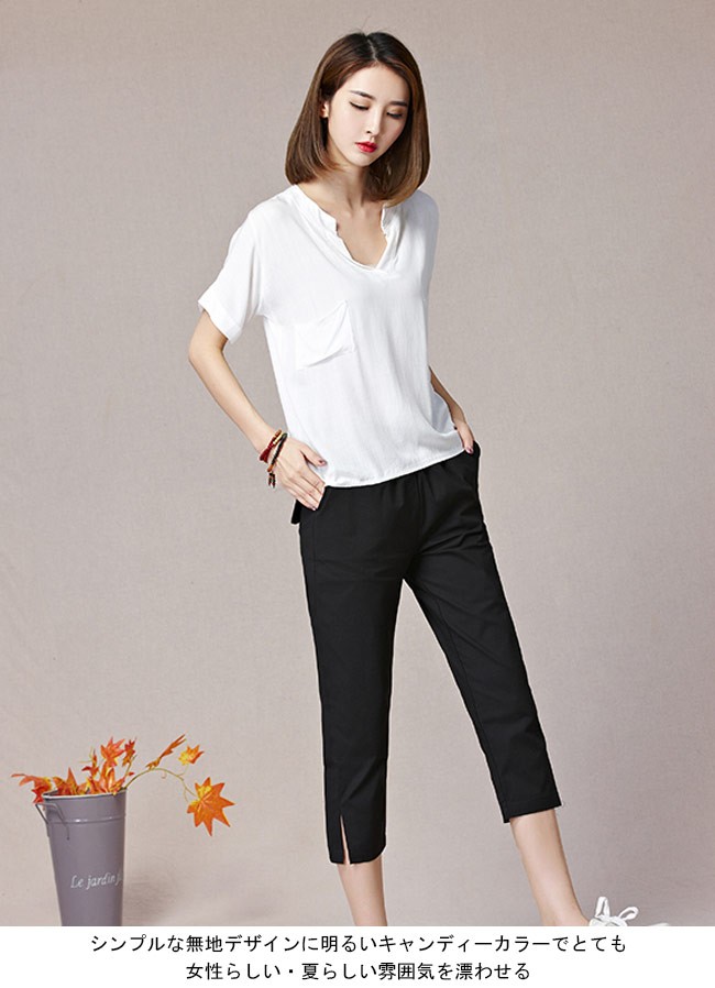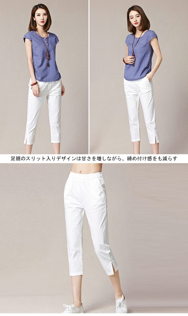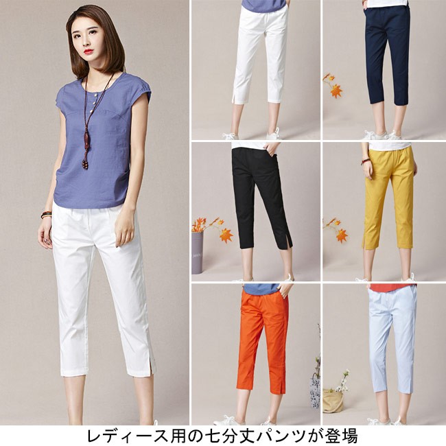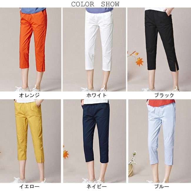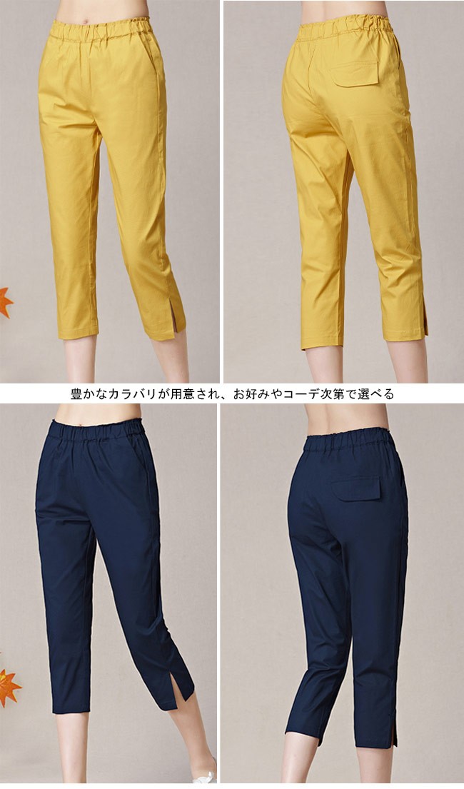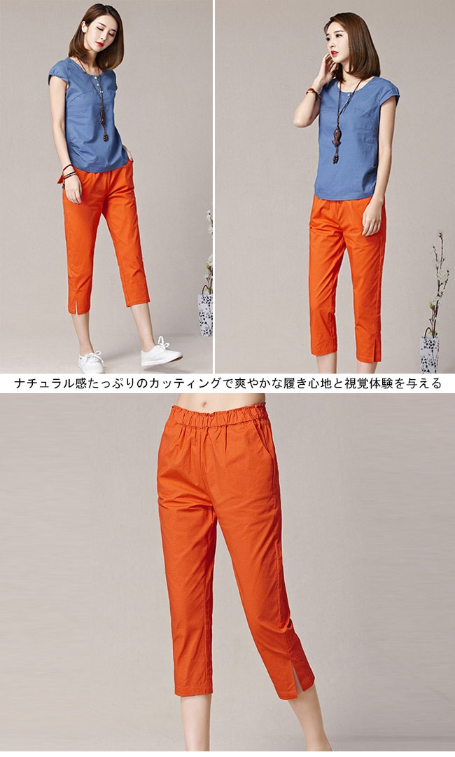 レディース クロップドパンツ ウエストゴム 女性用 サルエルパンツ 七分丈 夏物 ボトムス 七分丈パンツ スリット入り 着まわしレディース用の七分丈パンツが登場通気性・吸湿性に優れた上質な綿混紡素材を厳選、夏に最適な肌触りをもたらすナチュラル感たっぷりのカッティングで爽やかな履き心地と視覚体験を与える足裾のスリット入りデザインは甘さを増しながら、締め付け感をも減らすシンプルな無地デザインに明るいキャンディーカラーでとても女性らしい・夏らしい雰囲気を漂わせるカラー:オレンジ ホワイト ブラック イエロー ネイビー ブルー素材 綿混紡サイズ(cm) S M L XL 2XL 3XLS ウエスト62-84 ヒップ92 ワタリ53 総丈74M ウエスト66-88 ヒップ96 ワタリ54 総丈75L ウエスト70-92 ヒップ100 ワタリ55 総丈76XL ウエスト74-96 ヒップ104 ワタリ56 総丈772XL ウエスト78-100 ヒップ108 ワタリ57 総丈783XL ウエスト82-104 ヒップ112 ワタリ58 総丈79ご注意:※サイズは平置きサイズです。素人採寸ですので、若干の誤差がございます、ご了承ください。
