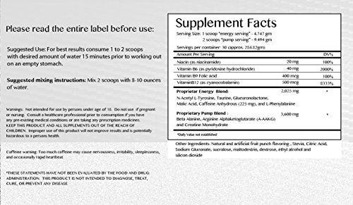Beta alanine, AAKG, Niacin, Vitamin B6 B9 and B12, N-Acetyl L-Tyrosine, Taurine, Glucuronolactone, Malic Acid, Caffiene Anhydrous, L- Phenylaline Creatine Blend for big, chiseled muscle development. A true trifecta with 0 Carbs/ 0 Calories!!!
