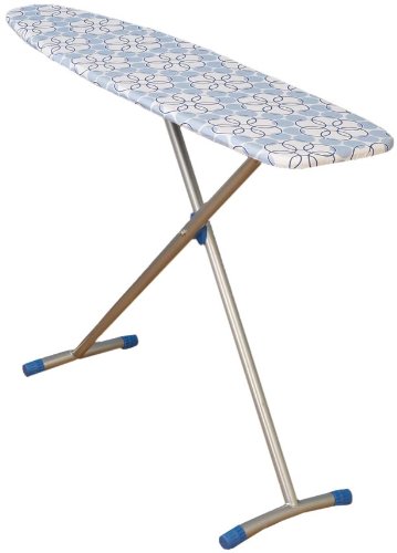 Household Essentials Classic T-Leg Ironing Board modernizes the classic ironing board, giving it an style upgrade via a sleek silver steel frame, arched foot that blends the stability of the 4-leg and the simplicity of the t-leg, and coordinated accent pieces to bring out the geometric prints on the one-piece cover and pad. This ironing board handles well, opening and closing with a level press. It adjusts between 4 height settings (33, 35, 37, and 39 inches high) using the same lever. Its unique stance adapts well to both carpeting and smooth surfaces. The board's steel frame is 35 mm in diameter and has blue plastic caps to protect floors and give the feet better grip on floors. The colorful caps complement the geometric piping print on the cover. The Euro Arch T-Leg stands 33-39 inches high (with 4 height settings at 2 inch increments), 14 inches wide, and 54 inches long, and weighs 10.8 lbs. It comes with a DELUXE cotton cover with 5 mm fiber pad.