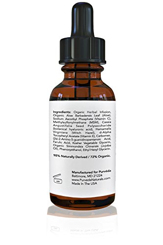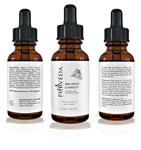 -. Binding : Misc. -. Brand : Purvéda -. EAN : 0716350657596 -. Feature : MULTIPLE ANTI-AGING BENEFITS Vitamin C serum pure formulation boosts collagen levels, softens lines, reduces age spots and provides antioxidant protection / SMOOTHER, SOFTER SKIN Formula gently exfoliates to rejuvenate the complexion while refining the pores and promoting radiance / EXCLUSIVE FORMULA Enriched with antioxidant vitamin E, moisturizing hyaluronic acid, soothing aloe vera extract and restorative ferulic acid / GENTLE NATURAL FORMULATION 98% natural|72% organic|100% vegan with no parabens or sulfates made at an FDA-registered facility in the USA / TRY IT RISK FREE If you don't see results from our vitamin C serum, simply let us know and we'll refund your money! -. PackageQuantity : 1 -. ProductGroup : Beauty -. ProductTypeName : BEAUTY -. Title : Purvéda Vitamin C 20% Serum for Face with Vitamin E and Hyaluronic Acid - Brightens Skin, Softens Fine Lines, Exfoliates and Tones - Natural & Organic, 1 Fl. Oz -. UPC : 716350657596