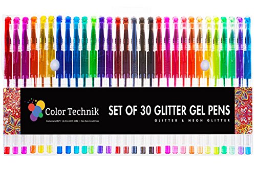 Glitter Gel Pens by Color Technik, Set of 30 Glitter Pens, Best Assorted Colors, Now with More Ink. Large Glitter Set on Amazon, Enhance Your Adult Coloring Book Experience Now! Perfect Gift Idea!