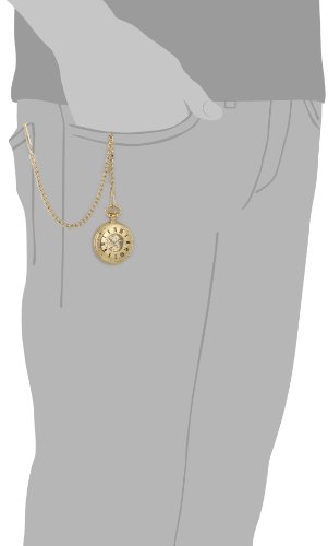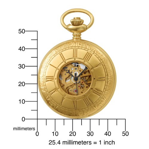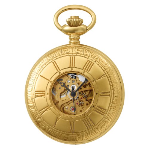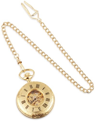 -. Feature : 14k gold-plated brass 47mm demy hunter case with a matching curb chain / Skeleton dial with roman numerals / 17 jewel mechanical movement / Deluxe gift box