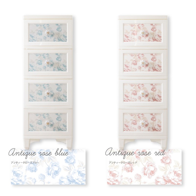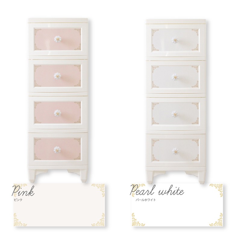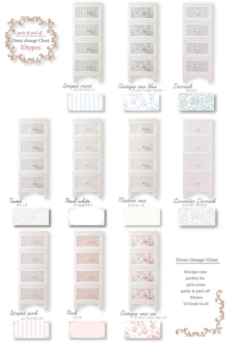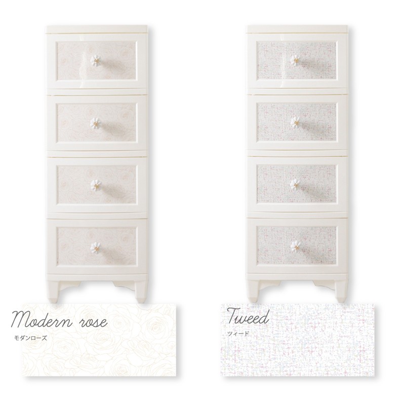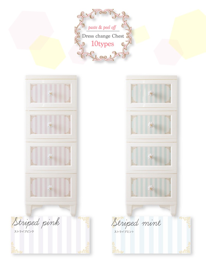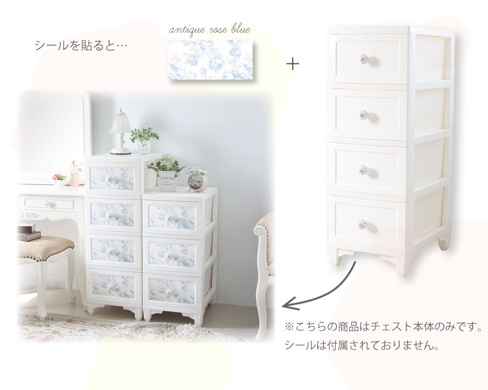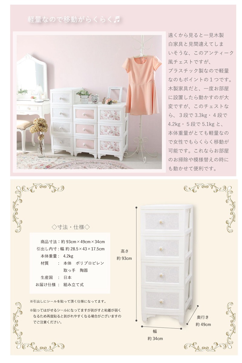 ◆商品説明◆Lilou de cocoアンティーク風チェストが新しくなりました!今度は前面パネルのシールが貼ってはがせるタイプの着せ替えチェストに!家具の買い替えはお金もかかるし体力的にも疲れる…でも、シールを張り替えるだけでガラッと雰囲気が変わるので家具を入れ替えたかのような気分を味わえます★お部屋の模様替えに合わせてチェストも模様替え!プラスチック製で軽いので女性でも持ち運びラクラク♪浴室の収納に…タオルや下着、パジャマなどの収納に。クローゼット内の整理にも◎見た目が可愛いのでクローゼットを開けた時に気分もあがります!!もちろんお部屋に収納チェストとしてもお使い頂けます。◆商品仕様◆サイズ(約):幅34cm×奥行49cm×高さ93cm重量:4.2Kg材質:(本体:ポリプロピレン)(取っ手:陶器)原産国:日本お届け仕様:組み立て式 引き出しの柄はシールで貼って頂く仕様です。※こちらの商品はチェスト本体のみです。シールは付属されておりません。※取っ手は1つ1つ手作業で造っている為、焼きムラ・色ムラ等に 個体差がありますが、風合いとしてお楽しみ下さい。