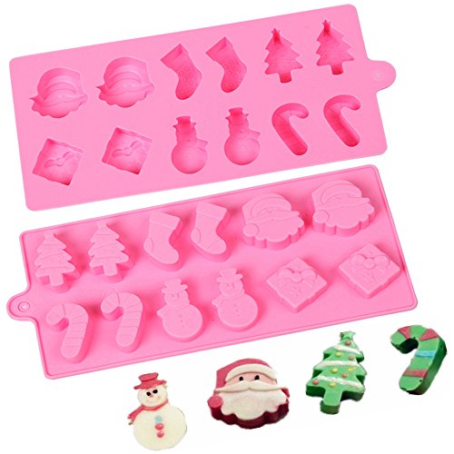 Megrocle 2 Pack 12-cavity Reusable Silicone Christmas Mold for Cake,Jelly, Chocolate,Candy and Ice Cubes with Santa Claus ,Snowman,Christmas Tree, Christmas Socks and More