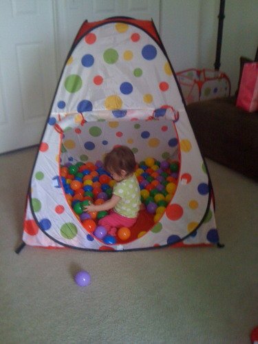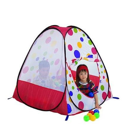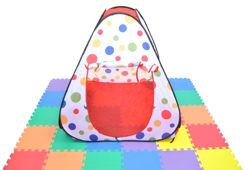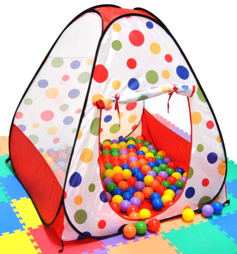 - Feature : Red polka dot theme twist play tent w/ a carry bag. Mats and balls NOT included and are sold separately. / Side openings with safety meshing for child play visibility. / Dimensions: Play Tent House : 39" L x 39" W x 39" H (inches) / Play tent that is easy to set up and store. Set up a playground in seconds! / The perfect gift for any child. We recommend 200 play balls with this tent.