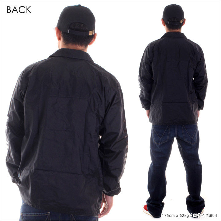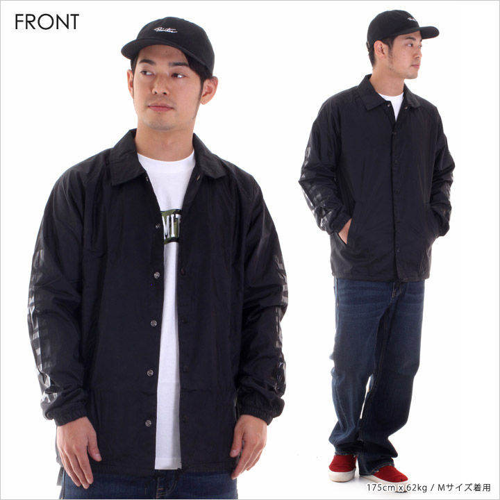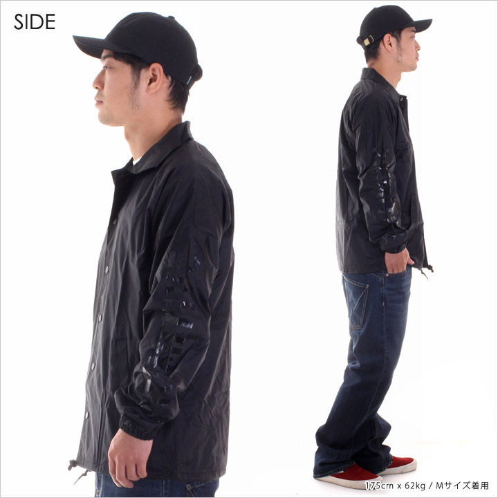 オールブラックで統一した男らしいジャケット。 両袖には同色ながら光沢感のあるプリントでダイナミックにロゴを配し、シンプルながらこだわりを感じるデザインに仕上がっています。 パーカーやシャツなど秋冬定番トップスとの相性も良く、ラフに本格的なスケータースタイルを演出してくれるオススメのアイテムです。