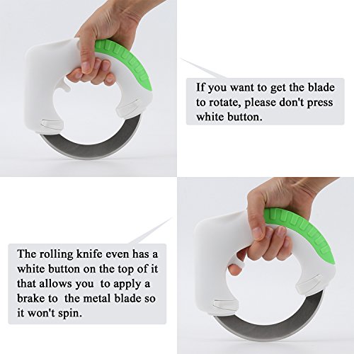 【Instructions for Use】 If you want to get the blade to rotate, Please don't press white button, the The rolling knife even has a white button on the top of it that allows you to apply a brake to the metal blade so it won't spin. You can check the picture FIVE.