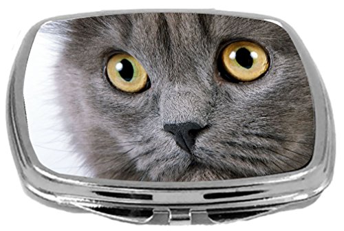 Rikki Knight Grey Fluffy Cat Face Close up with Yellow Eyes Design Compact Mirror, 17 Ounce