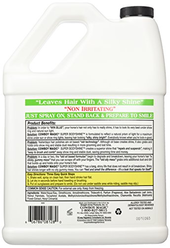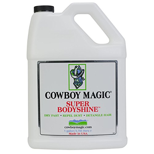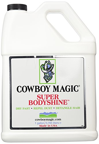 Studio : Charmar Land and Cattle Publisher : Charmar Land and Cattle Binding : Misc. Product Description COWBOY MAGIC SUPER BODYSHINE is formulated to give hair a super shine. Helps repel show ring dust and dries fast. Concentrated formula - can be used full strength or diluted up to 20-1. 0