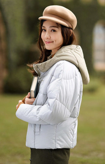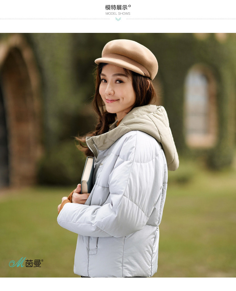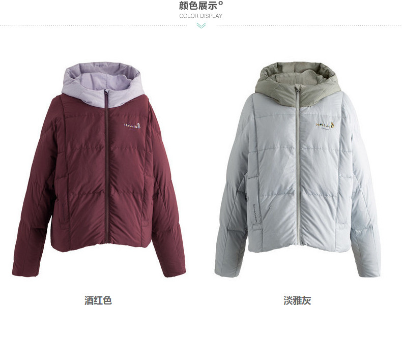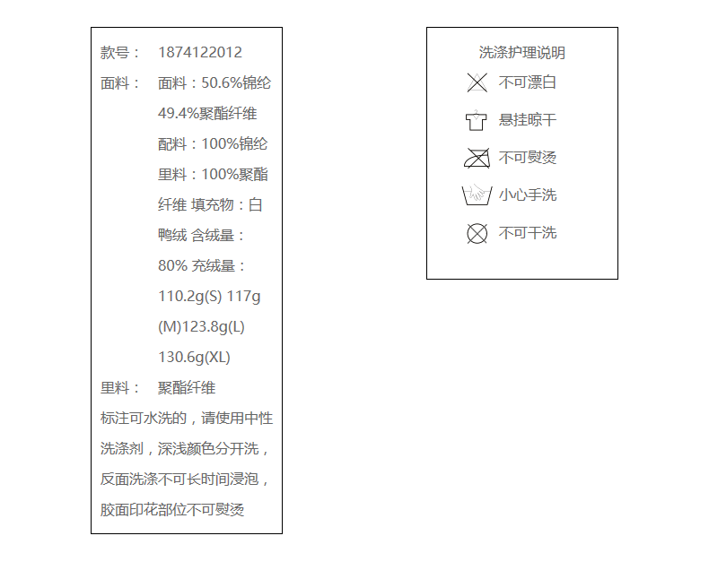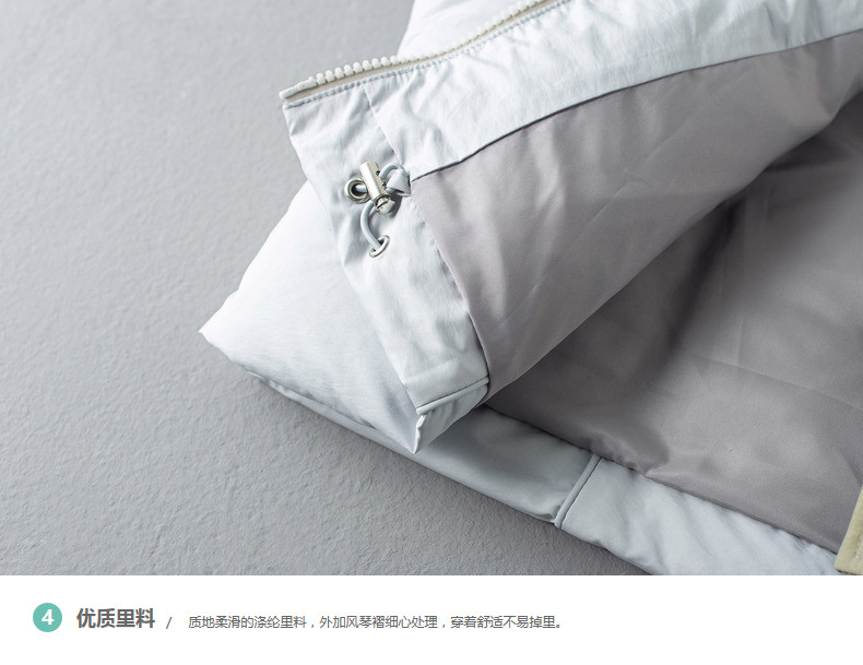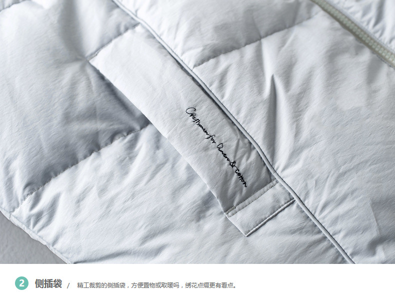 面料:50.6%锦纶 49.4%聚酯纤维 配料:100%锦纶 里料:100%聚酯纤维 填充物:白鸭绒 含绒量:80% 充绒量:110.2g(S) 117g(M)123.8g(L)130.6g(XL)