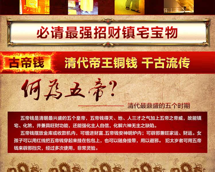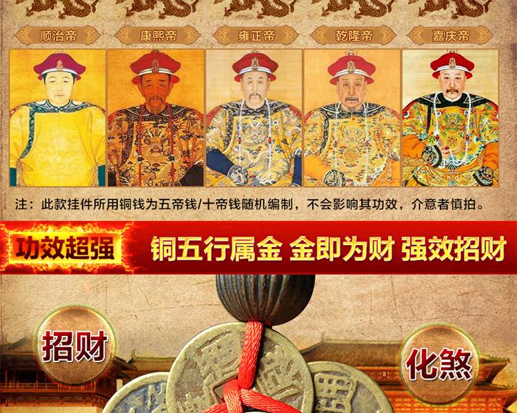 五帝钱乃清朝国运最昌盛的五朝制钱,它们次序是:顺治、康熙、雍正、乾隆、嘉庆。不仅时代相连,而且国运昌盛,社会安定繁荣,帝王独尊,百姓乐业,钱币铸造 精良,流通时久,得"天、地、人"之精气,是最佳的旺财风水用品。此五帝钱可带来财运,还能带来赌运。使用方法------将五帝钱放于钱包中,和钱放在 一起,作为母钱,这样母钱便可生小钱了,基本上可说是百用百灵。风水经上说:古钱招财化煞。所以五帝钱辟邪镇宅化煞的功能极强,大多数信奉风水的人都使用 五帝钱,把五帝钱当作法物使用,可见其威力之大。