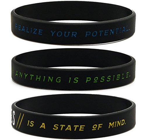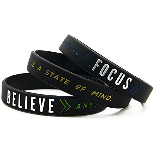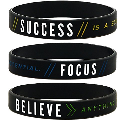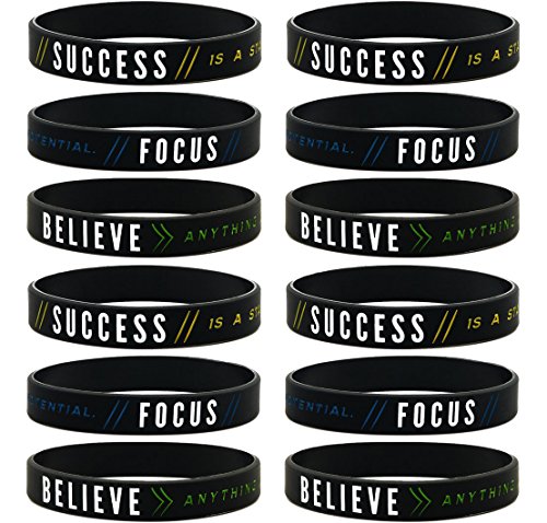 Bulk 12-pack of "Success, Focus, and Believe" silicone bracelets with motivational sayings; These wearable affirmations portray a positive message and are a suitable giveaway for business, fitness, student events, and more