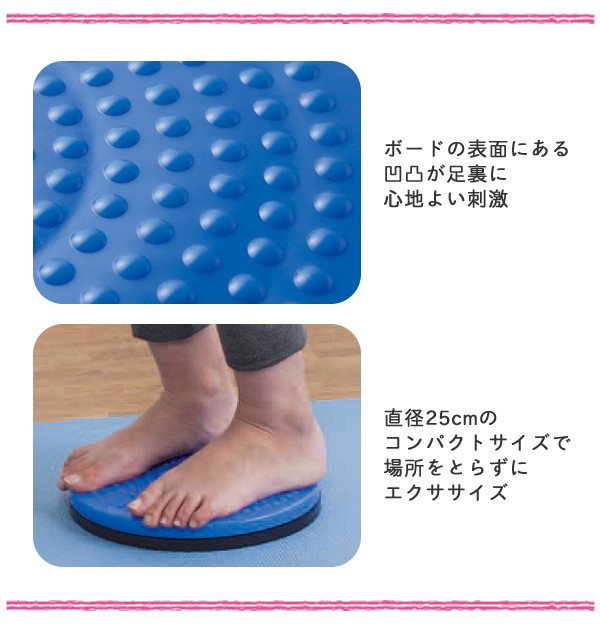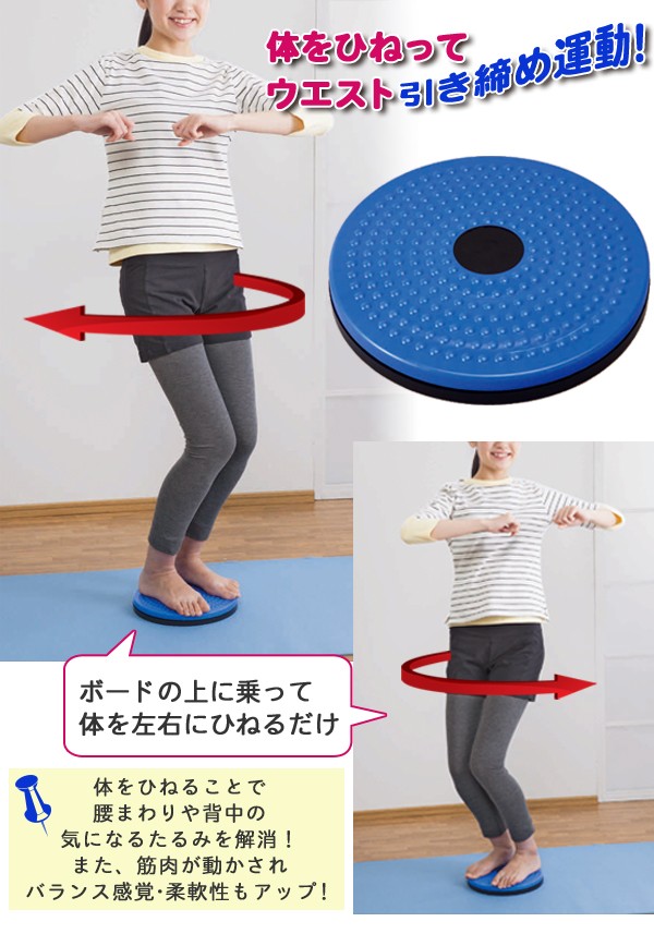 | 体をひねってウエスト引き締め運動!ボードの上に乗って体を左右にひねることで、腰回りや背中の気になるたるみを解消。筋肉が動かされバランス感覚・柔軟性のアップにもなります。直径25cmのコンパクトサイズで場所を取らずエクササイズできます。ボードの表面にある凹凸が足裏に心地よい刺激を与えてくれます。自宅で気軽にシェイプアップ! |
