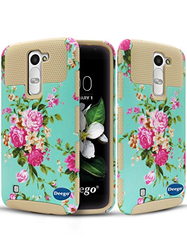 LG K7 Case, LG Tribute 5 Case, Deego 2-Piece Style Hybrid Armor Hard Shell Silicone Skin Case Shock Proof Full-Body Protective Defender Cases For LG K7, LG Tribute 5 with Stylus Pen (Gold+Rose)