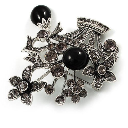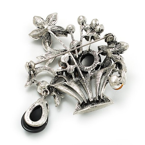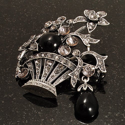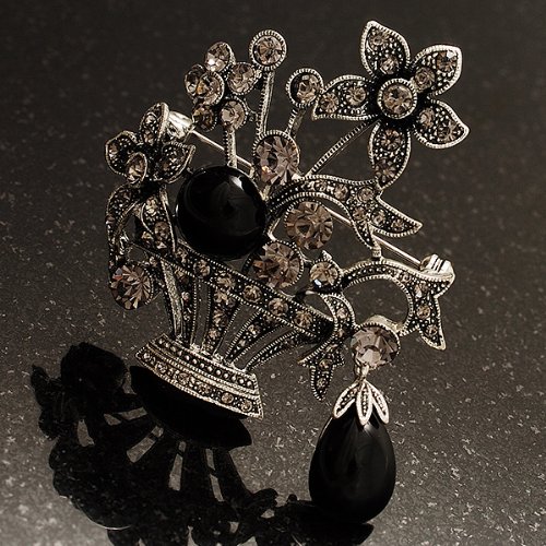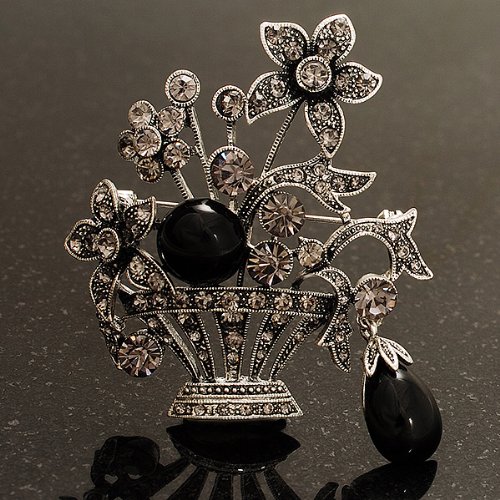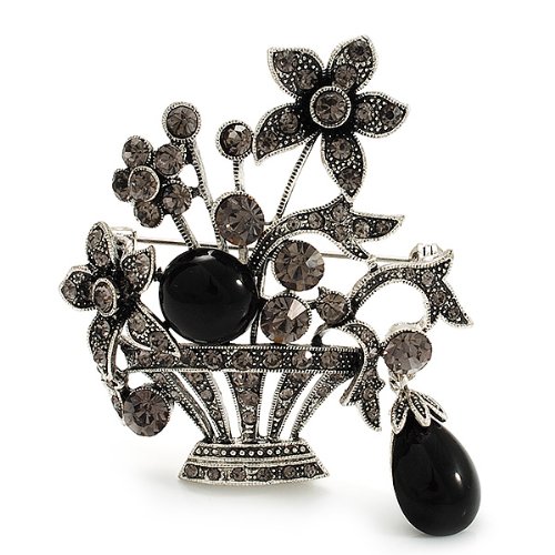 For an individual look, accessorise with this pretty Vintage Flower Basket Brooch. Featuring a vintage style flower basket, crafted in burn silver finish and decorated with black acrylic stones and dim grey crystals for a dash of sparkle. The brooch measures about 5.3cm x 5.8cm, fastens with a flag pin with revolver clasp. The brooch will add instant elegance to day or evening wear.Feature