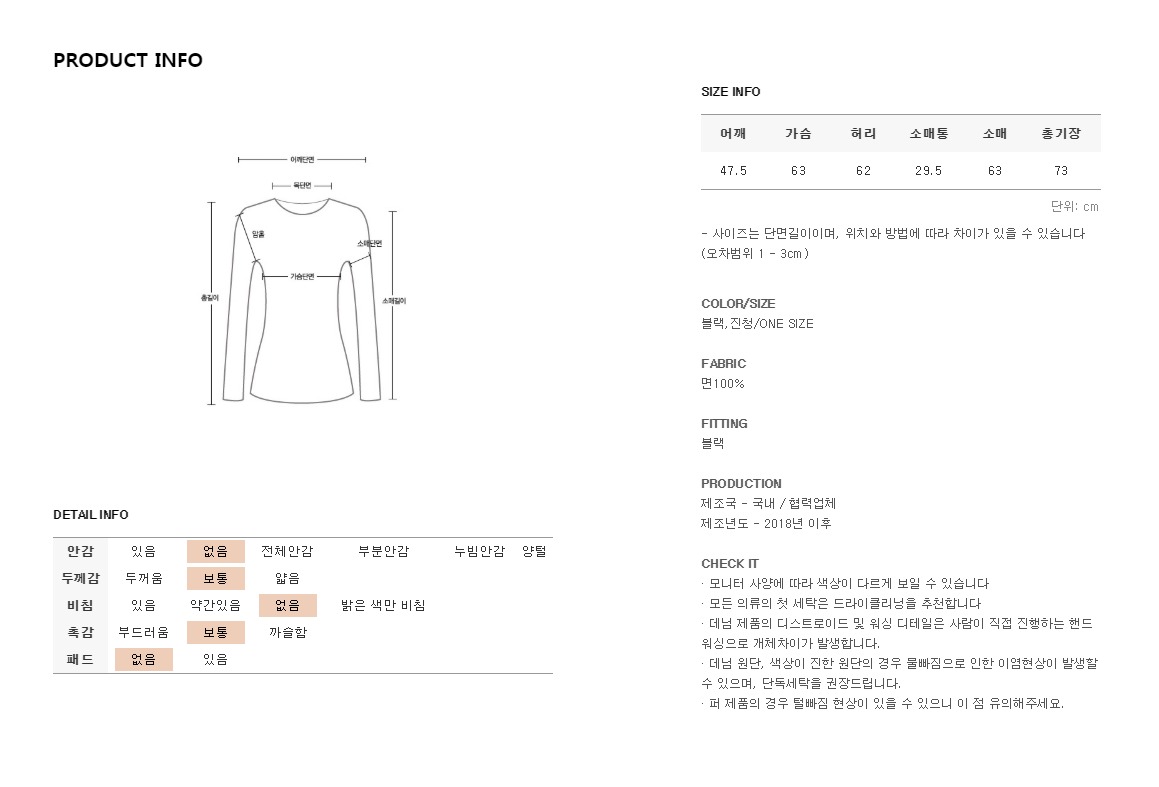 살짝 도톰한 데님소재로 단독으로는 물론 아우터로 입기에도 좋아요