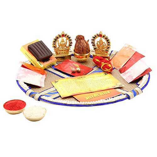 - Package Contains: 1 Decorated Pooja Thali, 1 Idol of Ganesh Ji, 1 Idol of Laxhmi Ji, 1 Pouch of kumkum, 1 pouch of Sindoor, 1 pouch of Akshat, 1 aarti book, 1 prarthna book, 1 packet of dhoop, 1 shreefal, 1 mouli bundle, 1 packet of mishery, 1 betalnut, 1 kalash, 2 containers.