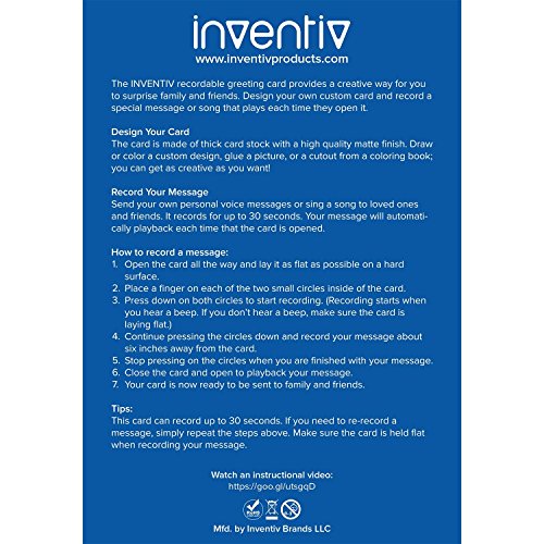 Imagine how surprised your loved ones will be when they open this one-of-a-kind card! Your special song or message plays automatically when they open it. Record for up to 30 seconds; you can easily re-record until you get your message or song perfect. We have engineered this card to produce the best possible sound; you won't believe how loud and clear the audio quality is! Not only can you record a special message, you can also apply your own unique design to this card. It is made of thick paper and has a high quality matte finish. The surface can easily be drawn/colored on or artwork can be glued to it as well. A perfectly fitted mailing envelope is included with your purchase. Surprise someone today with the Inventiv Recordable Greeting Card. What's In The Box? 1 - Recordable Card 1 - Instruction Sheet 1 - Envelope 0 |