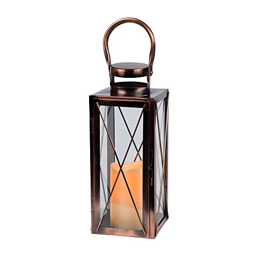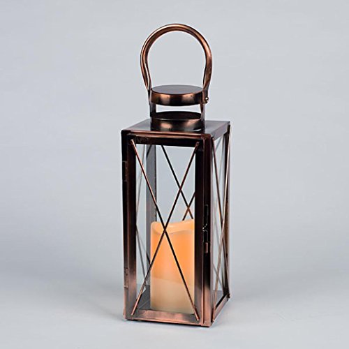 Studio : Gerson Publisher : Gerson Binding : Misc. Product Description Beautiful 12-inch copper colored metal lantern with rigid glass panes is perfect for your deck or patio. Includes one 3x4.5-inch indoor/outdoor flameless LED candle with 5 hour timer feature. Bisque color candle with wavy edge design and soft glow flicker. Gerson candles are flame-free, smoke-free and worry-free all while keeping the ambiance of candlelight. Requires 3 AAA batteries, included. 0